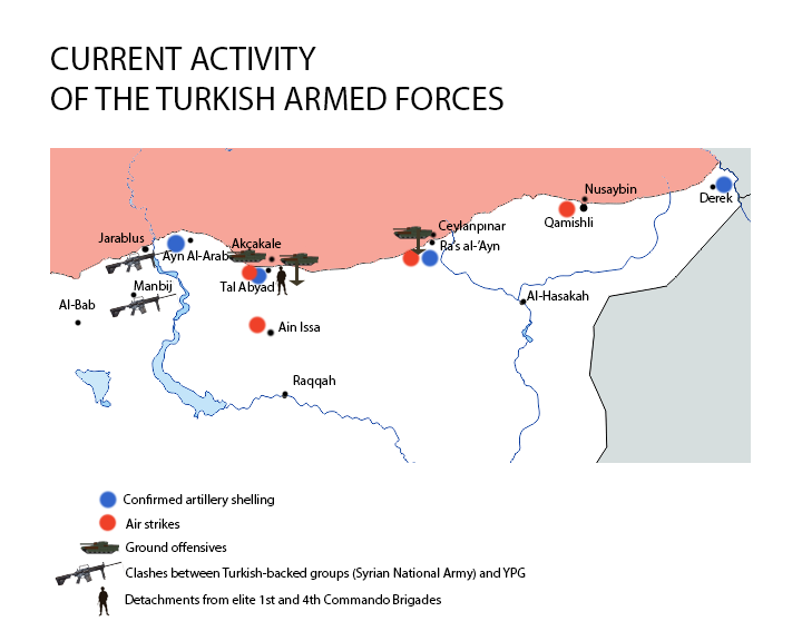 The campaign commenced by airstrikes and artillery shelling along the Syrian border, ranging from west of Ayn Al-Arab all the way to the Iraq-Syria-Turkey border areas. Turkish manned aircraft penetrated into 30km deep Syrian airspace. Mostly, the air interdiction has focused on Tal Abyad and Rasalayn, the two operational objectives for the ground offensive. Turkish military planners prefer enveloping the militant positions in these towns, and cut their lines of communications before the urban warfare phase. Open-source intelligence suggests that the Turkish ground forces have already secured 10km depth in some areas, and seized several villages around Tal Abyad and Rasalayn.