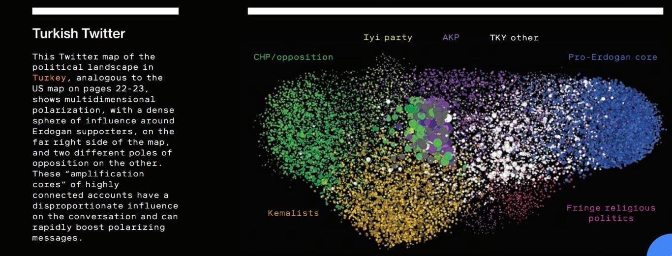 (Aşağıdaki görsel, Türkiye’deki Twitter kullanıcılarına ait paylaşımları politik aidiyetlerine göre gruplandıran bir harita. Kaynak: MIT Technology Review.) Sosyal medya platformlarının algoritmaları bizi sadece yakınımızdaki insanların düşüncelerini okumakla sınırlı kalmaya itiyor. Bu durum, ilgi duyduğunuz içeriklere erişim sağlama konusunda faydalı. Ancak karşıt düşünceleri duymadan bu demokrasi ortamında nasıl sağlıklı karar verebilir siniz? Veremezsiniz. Biz de iktidar sempatizanı arkadaşlara ulaşamıyoruz. Dijital dünyada eşit olarak her kesime sesimizi duyurmak bizim için ve demokrasimiz için önemli.