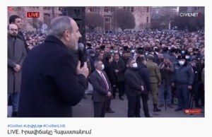 •   25 Şubat 2021 13:01 – Paşinyan, darbe girişimi sonrası sokağa çağırdığı, Cumhuriyet Meydanı’nda toplanmış olan destekçilerinin yanına geldi.