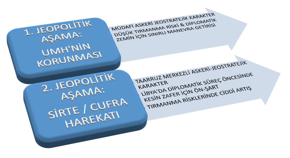 - Ulusal Mutabakat Hükümeti’nin (UMH) son dönem askeri başarılarını müteakip, Ankara’nın, Sarraj idaresi ile birlikte ortaya koyduğu jeopolitik hedef, 2015 öncesi dinamiklere dönülmesi ve petrol hilali bölgesinin UMH’nin kontrolüne girmesidir. İddialı olmakla birlikte, nihayetinde diplomatik çözüme gidecek olan Libya iç savaşı açısından, Türkiye’nin belirlediği hedef kesin bir siyasi-askeri zafere karşılık gelmektedir ve Clausewitzci harp – strateji teorisinin esasını andıran biçimde, ‘düşmana, politik iradenin silah gücüyle dayatılması’ anlamına gelecektir.