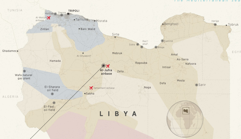 - Deniz kuvvetleri dışında, aşağıda örnek uydu görüntüleri alıntılanan US AFRICOM kaynaklı istihbarat verileri, Rusya Hava-Uzay Kuvvetleri’ne bağlı, milliyet işaretleri silinmiş Mig-29 avcı ve Su-24 av / bombardıman uçaklarının Cufra Üssü merkezli konuşlandırıldıklarını göstermektedir.
